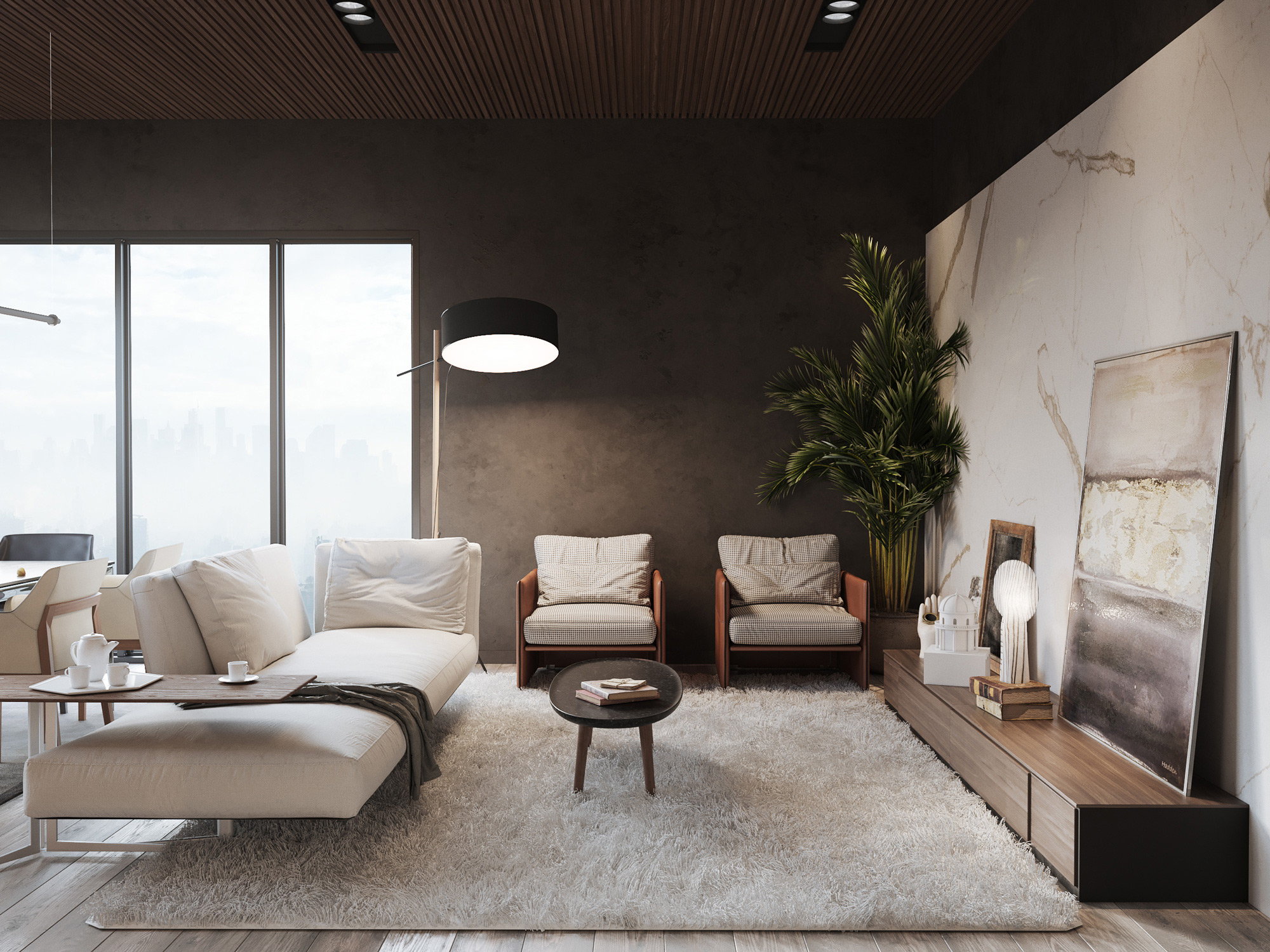 Designers, iconic furniture was used to achieve elegant, sophisticated look.